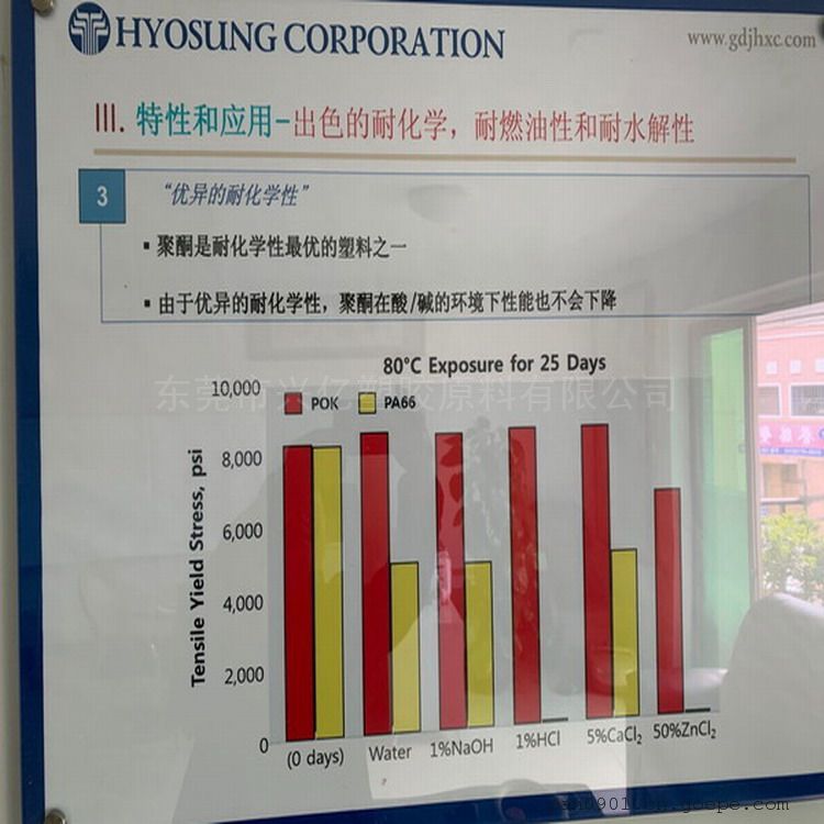 POK聚酮树脂是一款新型环保特殊工程塑料,是韩国晓星集团研发生产出的一款综合性能优良的工程塑料,属于聚酮类材料,是由CO、乙烯、丙烯聚合而成的新型绿色聚合物材料。经测试其具有高冲击强度,相比尼龙、PBT冲击强度要高230,杰出的抗水解性,很高的拉伸强度,优异的冲击强度和伸长率,高韧性,高抗张强度和弯曲模量。优越的抗化学性,耐酸、碱,优越的耐燃油性,高热变形温度,优越的耐磨性,高阻隔性。